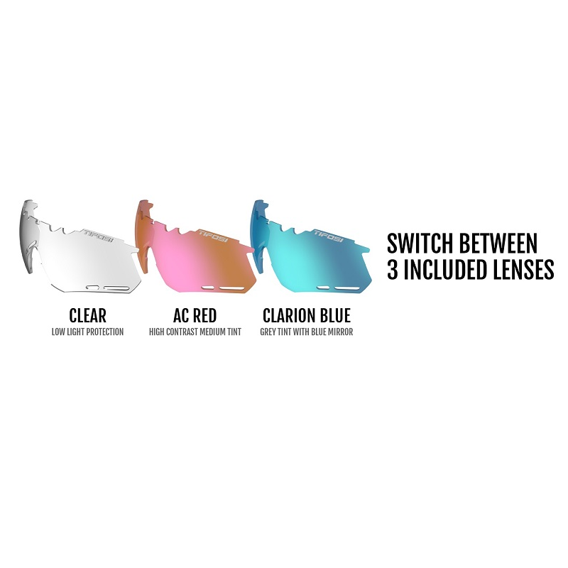 Tifosi’s Clarion Mirror lenses feature a hydrophobic coating that repels water and sweat to help prevent moisture from gathering on the lens, increasing visibility and preventing distortion. Available in one of five bold colors. i] Hydrophobic reflective lens repels water & sweat ii] Reflective Mirror Lens iii] Consistent lens color — no distortion iv] Available in Clarion Blue, Clarion Red, Clarion Purple, Clarion Green & Clarion Yellow